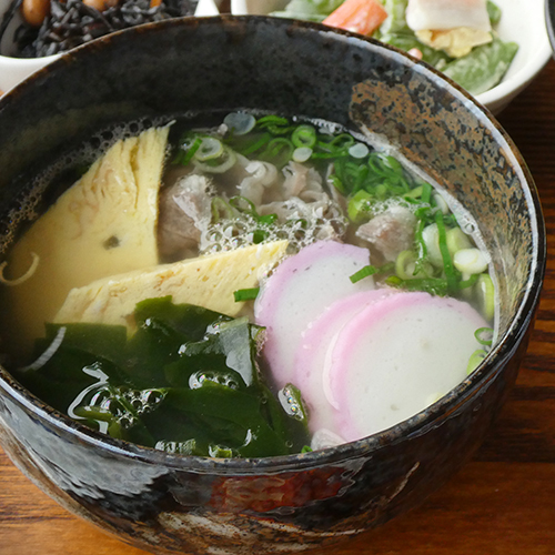 名張のB級ご当地グルメ「牛汁」は、その昔肉屋の職人たちが余った具材などで作ったまかない料理「牛肉入りのお吸い物」が原点。和風醤油ダシ、伊賀牛肉、ネギをベースに、店ごとに様々なアレンジを加えています。さんきゅうやならではの牛汁をご堪能下さい。